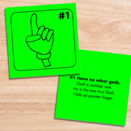 Keep playing until every card has been flipped over and every commandment has been said or shown.